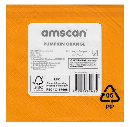 PUMPKIN ORANGE BEVERAGE NAPKINS / SERVIETTES (PACK OF 40)